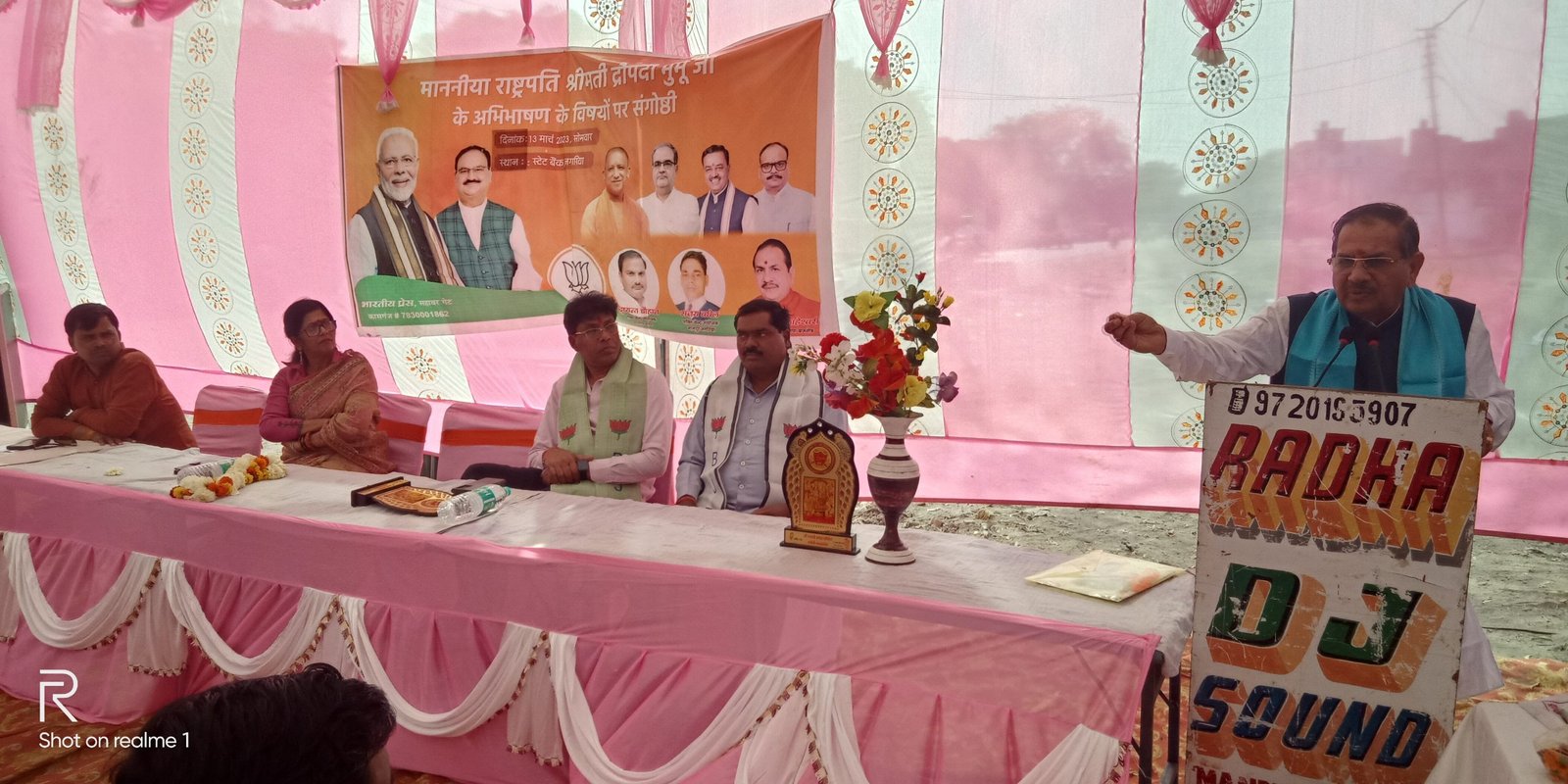 सभा मे उपस्थित पार्टी कार्यकर्ताओं को राष्ट्रपति अभिभाषण को लेकर सम्बोधित करते हुए कहा कि केन्द्र व राज्य की भाजपा सरकारों ने बिना किसी भेदभाव के सबके लिए समान रूप से विकास कार्य किये हैं। उन्होंने 2024 में केन्द्र में फिर से भाजपा सरकार बनवाने का आह्वान कार्यकर्ताओं से किया। सभा को जिलाध्यक्ष के0पी0 सिंह सोलंकी, किसान मोर्चा जिला उपाध्यक्ष बृजेंद्र सिंह गौर, आदि ने भी सम्बोधित किया कार्यक्रम का संचालन मण्डल अध्यक्ष मनोज चौहान ने किया। इस दौरान प्रमुख रूप से मण्डल महामन्त्री सत्यवीर कश्यप, मण्डल उपाध्यक्ष अभय प्रताप सोलंकी, अनुज चौहान, मण्डल कोषाध्यक्ष रवि चोपड़ा, मोहित गौर, सेक्टर संयोजक दुष्यंत चौहान, संजय बघेल, बूथ अध्यक्ष प्रमोद कश्यप, सत्यवीर शर्मा, अतुल चौहान, रामेश्वर मौर्य, मनोज राघव , शंकरपाल प्रधान, संजय सोलंकी, प्रेम साहू, हरिओम मिश्रा सहित सैकड़ों कार्यकर्ता मौजूद रहे।