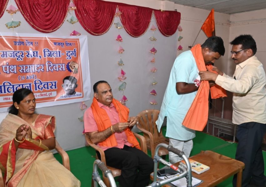 भारतीय मजदूर संघ जिला दुर्ग द्वारा अलग-अलग धर्म के लोगों द्वारा जो सामाजिक सद्भावना के लिए उत्कृष्ट कार्य किए हैं उनका सम्मान प्रदेश महामंत्री दिनेश पांडेय, विभाग प्रचारक श्री रोशन साहू जी के द्वारा किया गया, जिसमें बी डी निजामी जी पत्रकारिता जगत से है एस पी एस नोटे जी श्रमिक क्षेत्र से, आचार्य रामानुगानंद जी सामाजिक क्षेत्र व शिक्षा क्षेत्र से, वीनस साईमन जी असंगठित श्रम क्षेत्र से, जान आर्थर जी समाजसेवी, उनके योगदान के लिए सम्मानित किए गए।